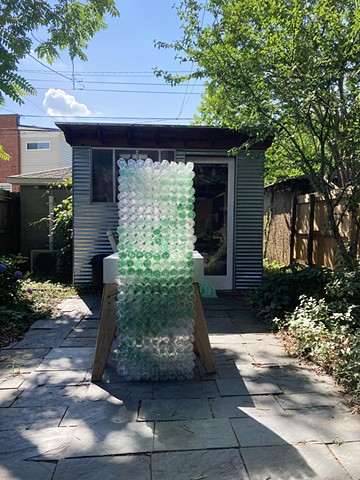 Green and clear bottles are shredded and stuffed inside the bottles in varying amounts to provide color graduation.